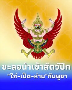 าชกิจจานุเบกษา เผยแพร่ประกาศกรมปศุสัตว์ ขยายเวลาอีก 90 วัน ชะลอนำเข้าสัตว์ปีกจากกัมพูชา ทั้งไก่ เป็ด ห่าน หงส์ น้ำเชื้อสำหรับผสมพันธุ์