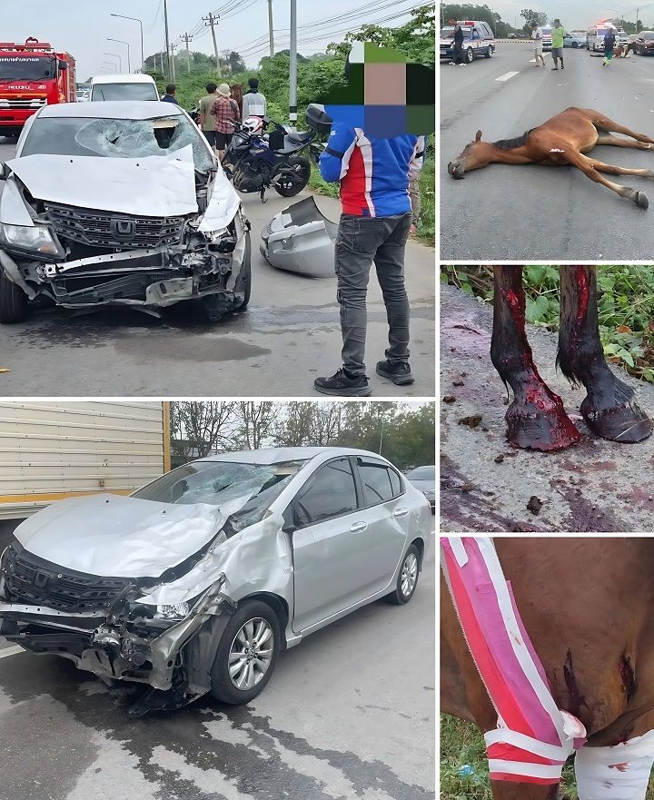 จากการสอบถามนายทรรศ ผู้ขับขี่รถยนต์เก๋งก็ให้การว่าขณะกําลังขับรถเข้าตัวเมืองราชบุรี จู่ๆ ก็มีฝูงม้า โผล่ขึ้นมาจากข้างทางวิ่งตัดหน้ารถอย่างกะทันหันในระยะกระชั้นชิด ทําให้เบรครถไม่ทัน ทำให้พุ่งชนอย่างจังจนม้ากระเด็นไปตายและบาดเจ็บ ส่วนรถก็พังยับ